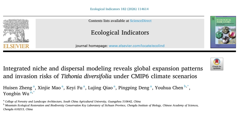 近日,林学与风景园林学院吴永彬教授团队在国际期刊Ecological Indicators(中科院一区TOP期刊,影响因子7.4)发表学术论文,这是继2024年在Frontiers in Plant Science(中科院二区TOP期刊)发表关于外来入侵植物的重要研究成果。这两项研究系统揭示了两大恶性入侵植物——银胶菊(Parthenium hysterophorus)和肿柄菊(Tithonia diversifolia)的入侵历史、扩散机制与未来风险,为全国乃至全球区域尺度的入侵物种早期预警与精准防控提供了重要的科学依据与实践指导。