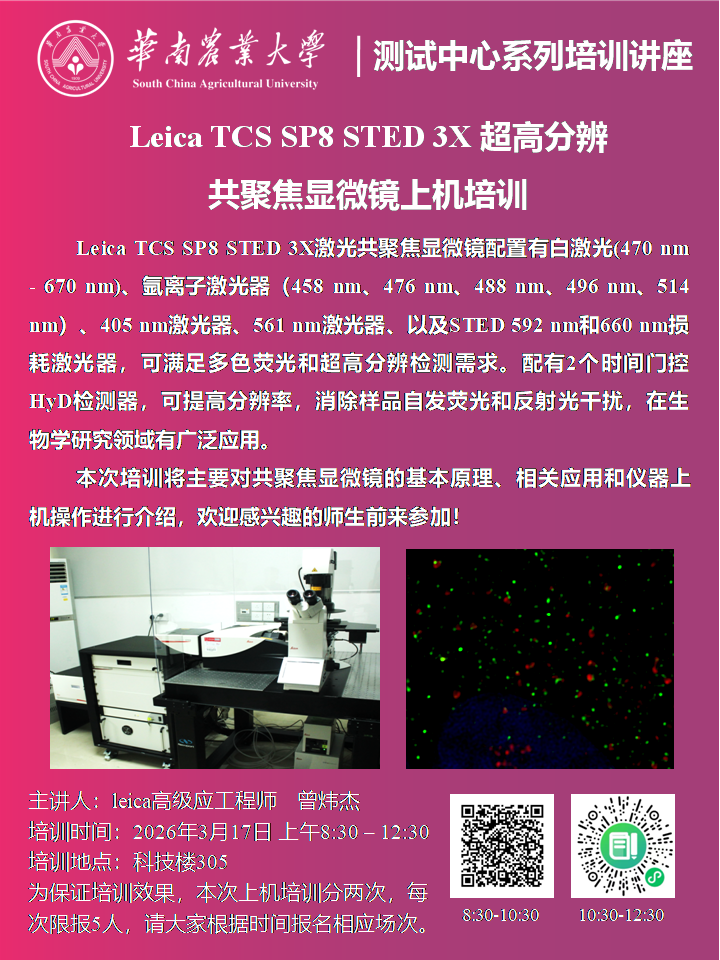 测试中心系列培训讲座(2026年第2期):Leica TCS SP8 STED 3X超高分辨共聚焦显微镜上机培训