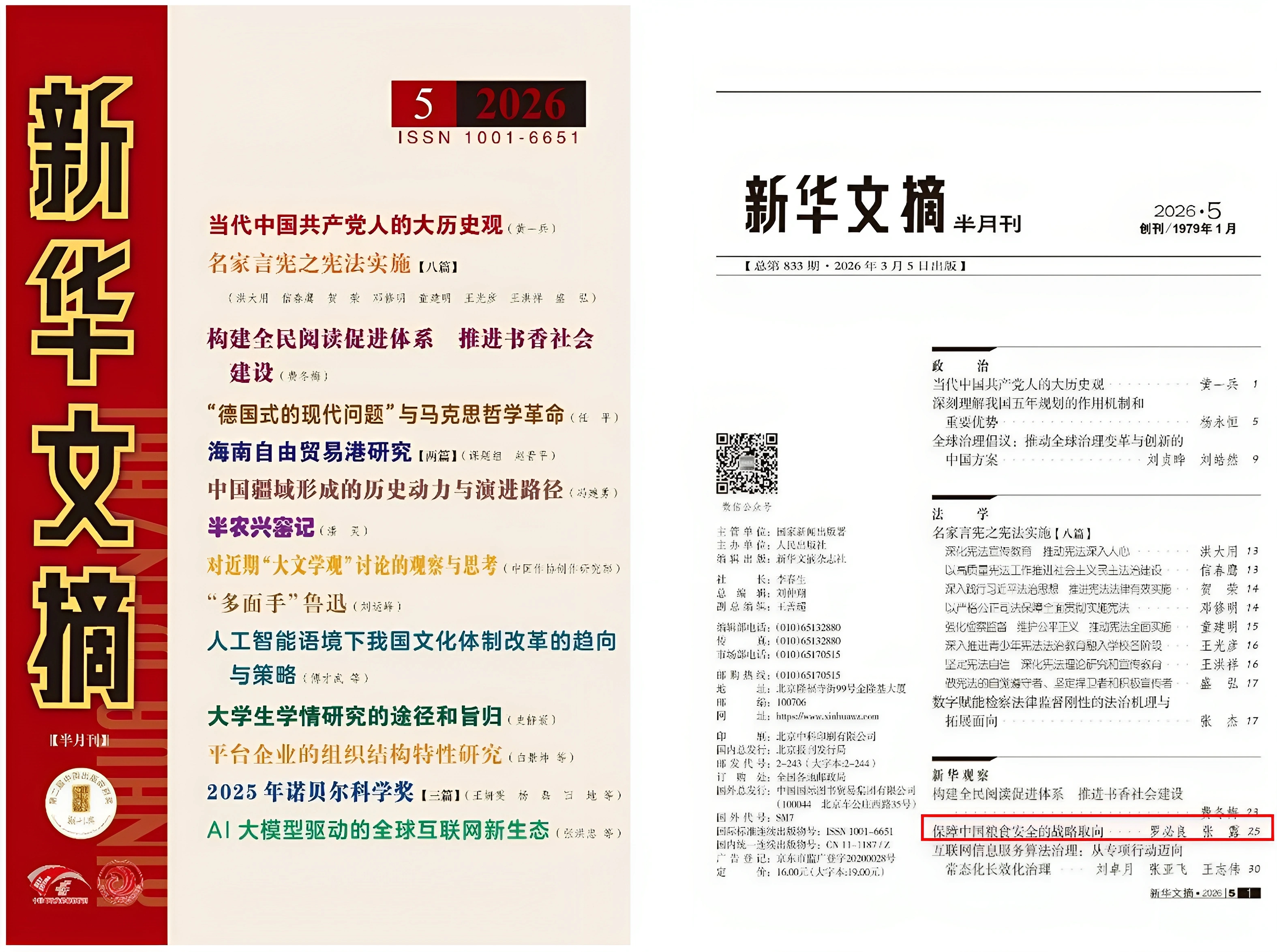 罗必良、张露两位教授发表在《改革》杂志2025年第10期的特稿论文《保障中国粮食安全的战略取向》,被《新华文摘》2026年第5期全文转载。该文从判断(对中国粮食安全问题的总体把握)、回顾(2007—2008 年全球粮食危机及其深层影响)、反思(中国“藏粮于民”模式弱化与应急体系构建)、调整(中国粮食安全的本质要求与逻辑转换)、选择(“十五五”时期保障中国粮食安全的战略方向与核心策略)等多个层面对中国粮食安全问题展开了系统论述。