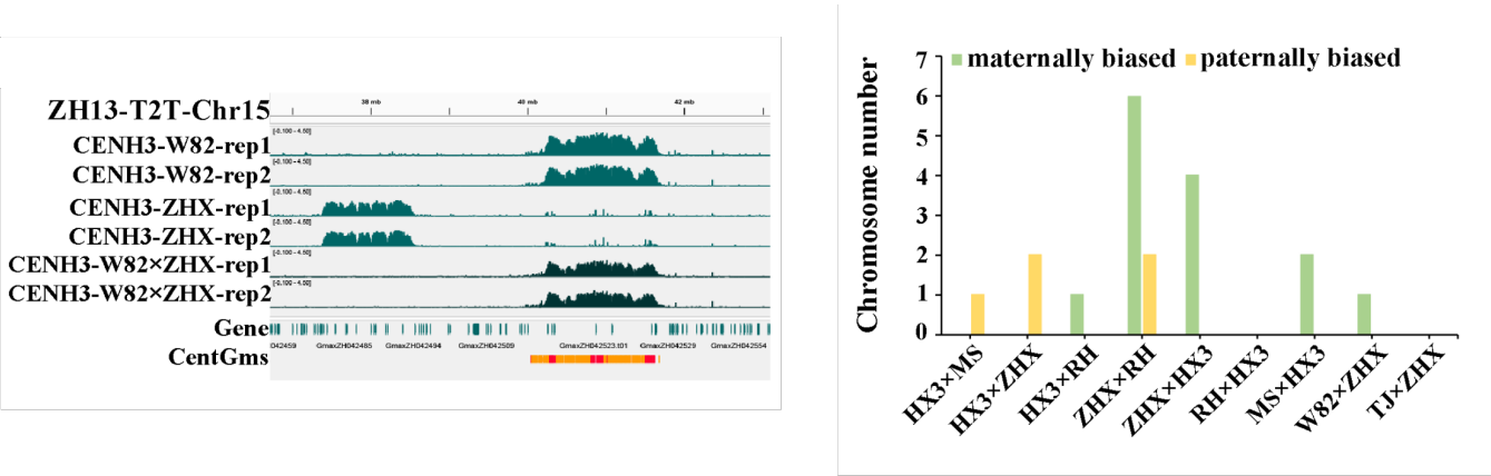 为了探究育种杂交过程中着丝粒的遗传稳定性,研究团队对9个杂交组合的F1代及其亲本进行系统分析,发现CENH3在杂交后代的加载并非简单的亲本继承,而是呈现出高度动态且多样化的模式。在杂交F1代中,CENH3的加载表现出维持、减少、消失及增加等多种状态。甚至在某些情况下,杂交后代会在父母都没有着丝粒的新位置上,组装出全新的功能性着丝粒。令人意外的是发现了显著的“亲本偏向性”加载现象:在某些杂交组合中,后代的着丝粒会表现出明显的“父系偏向”或“母系偏向”。特定品种表现出极强的诱导能力,能让杂交后代的着丝粒更多地模仿它的模式。这说明大豆杂交不仅仅是基因的简单相加,着丝粒层面的表观遗传重塑可能在杂交种的形成中扮演了关键角色。