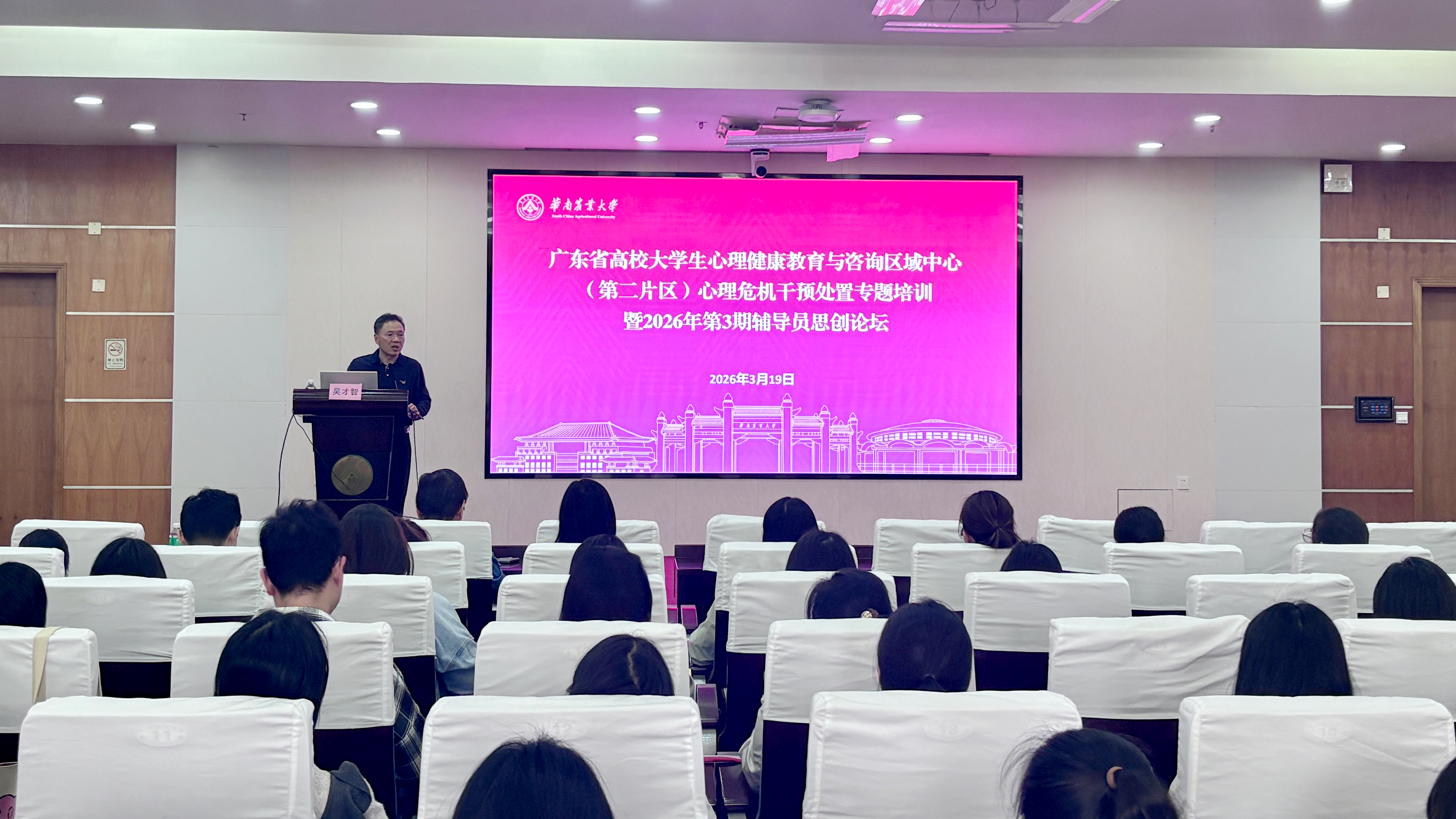 为扎实推进健康学校建设,进一步提升区域内高校心理育人工作者对大学生心理危机的精准识别和干预处置能力,筑牢校园心理安全防线,3月19日,广东省高校大学生心理健康教育与咨询区域中心(第二片区)在华农举行“心理危机干预处置”专题培训。国内知名心理健康与危机干预专家、华中师范大学心理健康教育中心主任吴才智教授应邀做辅导报告。