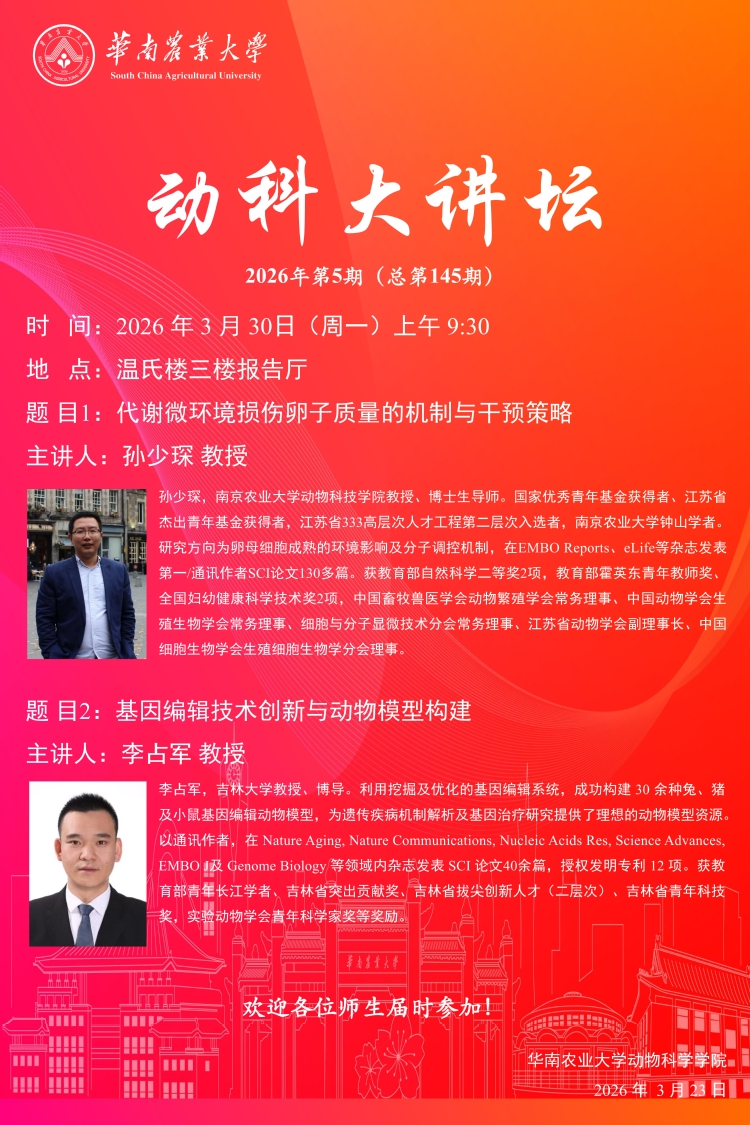 动科大讲坛(第145期):代谢微环境损伤卵子质量的机制与干预策略/基因编辑技术创新与动物模型构建