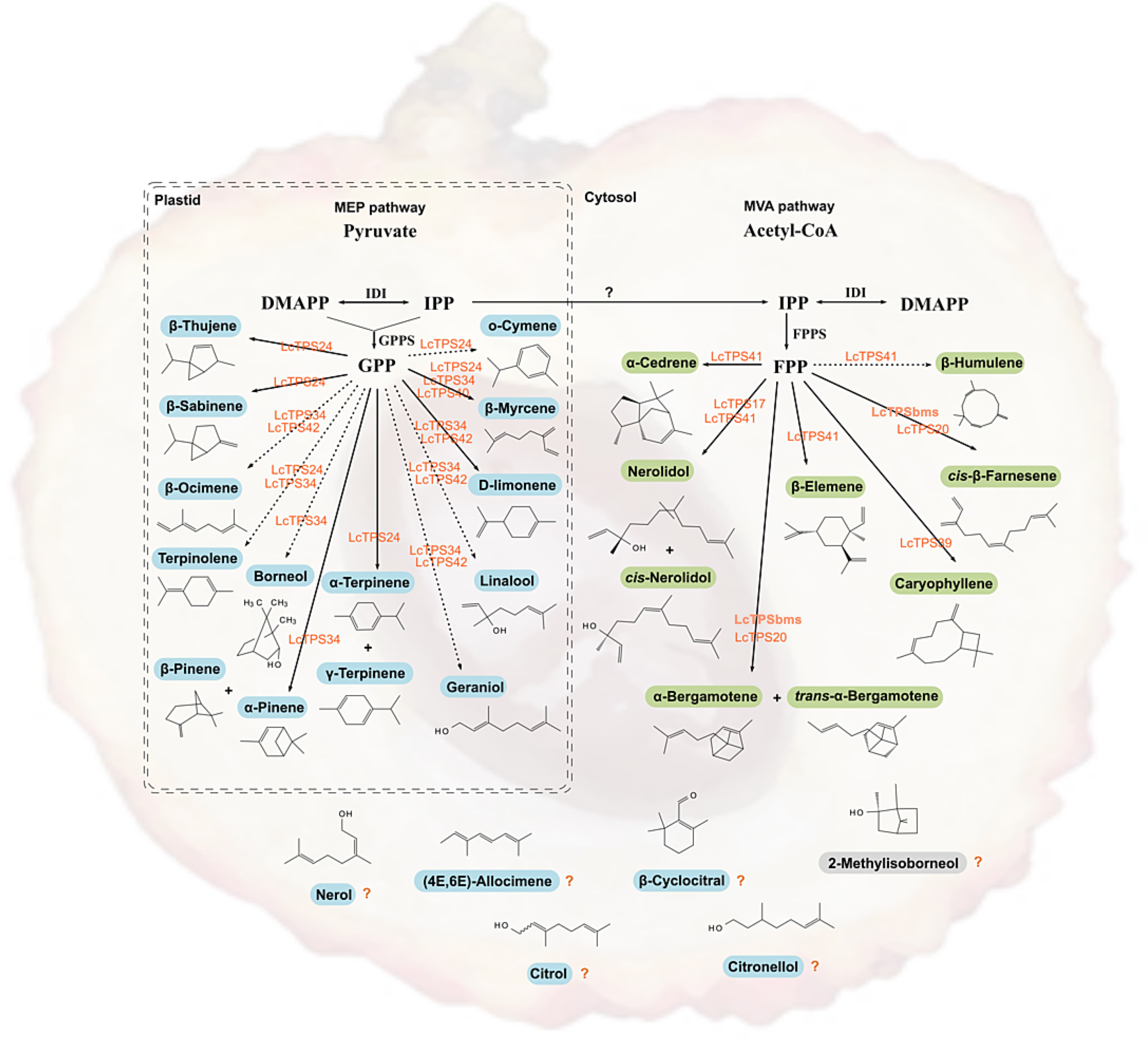 一是揭示了DOF转录因子在萜类“花果香”合成中的调节功能:萜类挥发物是塑造荔枝“花果香”的核心物质基础。研究精准锁定了石竹烯、香叶醇和D-柠檬烯等14个决定花果香味浓淡的核心萜类物质,挖掘并鉴定了9个在果肉中优势表达的萜类合成酶(LcTPSs)功能,初步构建了荔枝萜类挥发物的合成网络(图1)。进一步研究首次揭示了DOF家族转录因子的核心调控功能,成功解析了LcCDF3-LcTPS39和LcDOF5.8-LcTPSbms两个平行的关键转录调控模块,证实其分别正向调控石竹烯(丁香香气)与α-佛手柑烯(清甜橘香)的合成,从分子层面解析了荔枝浓淡香型分化的关键机制。