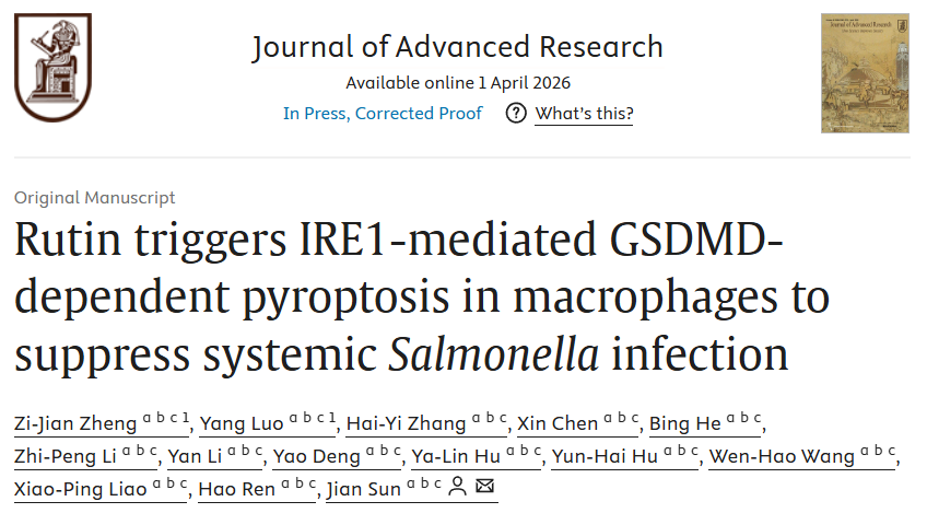 近日,兽医学院孙坚教授团队在Journal of Advanced Research(中科院一区Top期刊,影响因子13.0)杂志上发表了题为“Rutin triggers IRE1-mediated GSDMD-dependent pyroptosis in macrophages to suppress systemic Salmonella infection”的最新研究成果。
