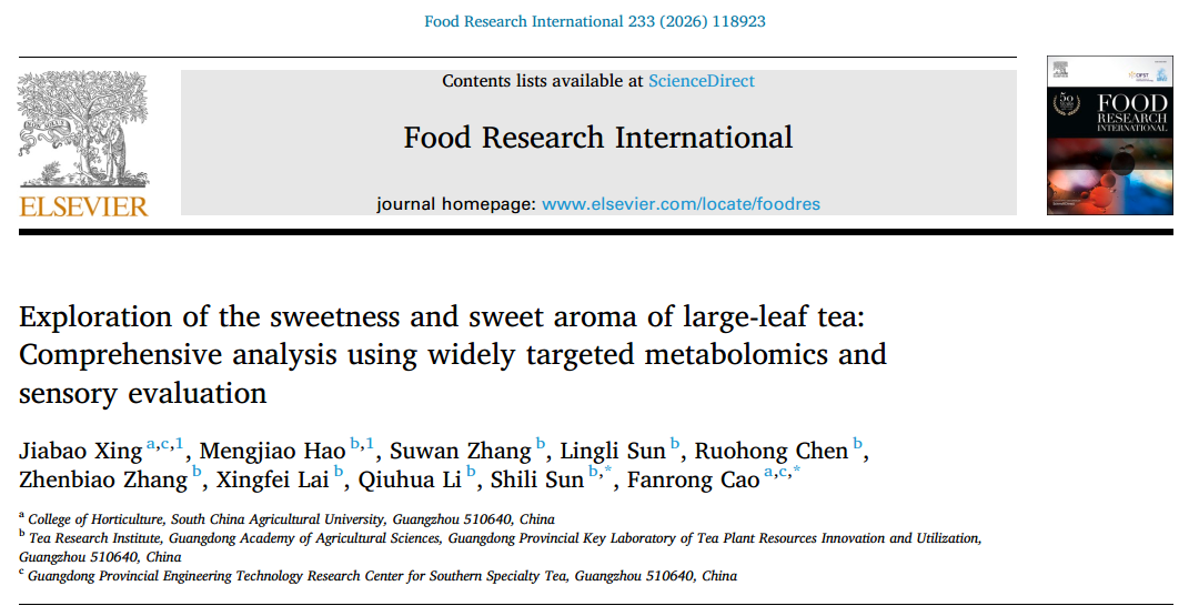 近日,园艺学院茶叶团队曹藩荣教授等人在Food Research International(中科院一区Top期刊,影响因子8.0)在线发表了题为“Exploration of the sweetness and sweet aroma of large-leaf tea: Comprehensive analysis using widely targeted metabolomics and sensory evaluation”的研究论文。