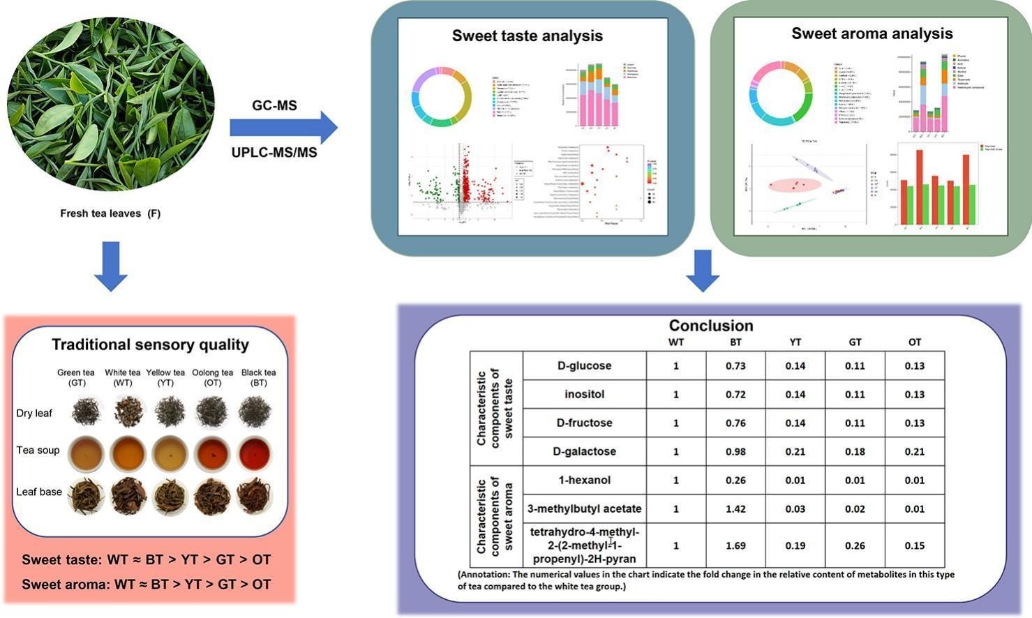 该团队以英红九号大叶茶鲜叶为原料,按照国家标准加工工艺制成绿茶、红茶、白茶、黄茶、乌龙茶五种茶类,通过传统感官评价与广泛靶向代谢组学(非靶向代谢组学UPLC-MS/MS、挥发性代谢组学GC–MS/MS)联合分析发现:五种茶类的甘甜风味表现存在显著差异,红茶、白茶的甜味与甜香表现显著优于绿茶、黄茶、乌龙茶;从代谢物层面,共鉴定出1433种非挥发性代谢物和663种挥发性代谢物,筛选出528种差异非挥发性代谢物和625种差异挥发性代谢物;其中红茶、白茶中含有更高浓度的D-葡萄糖、肌醇、D-果糖、D-半乳糖等甜味代谢物,而L-组氨酸、儿茶素等苦味代谢物含量较低;鉴定出5-乙基-3-羟基-4-甲基-2(5H)-呋喃酮、二氢-2-甲基-3(2H)-呋喃酮等6种挥发性代谢物为五种茶类共有的甜香核心贡献物质,四氢-4-甲基-2-(2-甲基-1-丙烯基)-2H-吡喃、1-己醇、乙酸3-甲基丁酯为红茶、白茶甜香显著的关键特征物质;KEGG富集分析显示,半乳糖代谢通路是调控大叶茶甜味形成的核心通路,单萜生物合成、次生代谢物生物合成通路参与甜香物质的合成调控,且白茶、红茶的甘甜风味形成分别依赖苯甲醛、香叶醇的特异性调控。此外,研究还发现不同茶类的加工工艺对代谢物的调控存在显著差异,白茶、红茶的萎凋、发酵工艺更利于甜味代谢物积累和苦味代谢物降解,而绿茶、乌龙茶的杀青、摇青工艺则易导致苦味物质富集,这可能是不同茶类甘甜风味差异形成的重要加工调控因素。