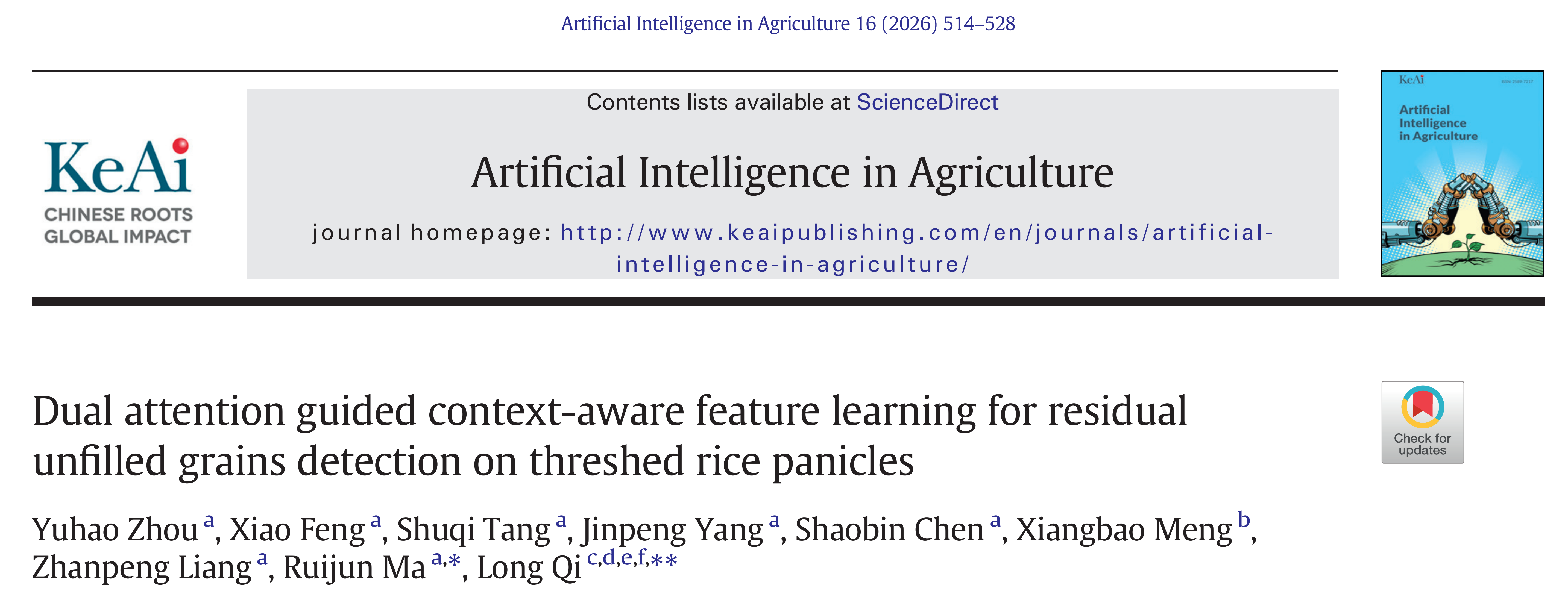 近日,水利与土木工程学院齐龙研究员团队在Artificial Intelligence in Agriculture(中科院一区Top期刊,影响因子12.4)期刊上发表了题为“Dual attention guided context-aware feature learning for residual unfilled grains detection on threshed rice panicles”的研究成果。