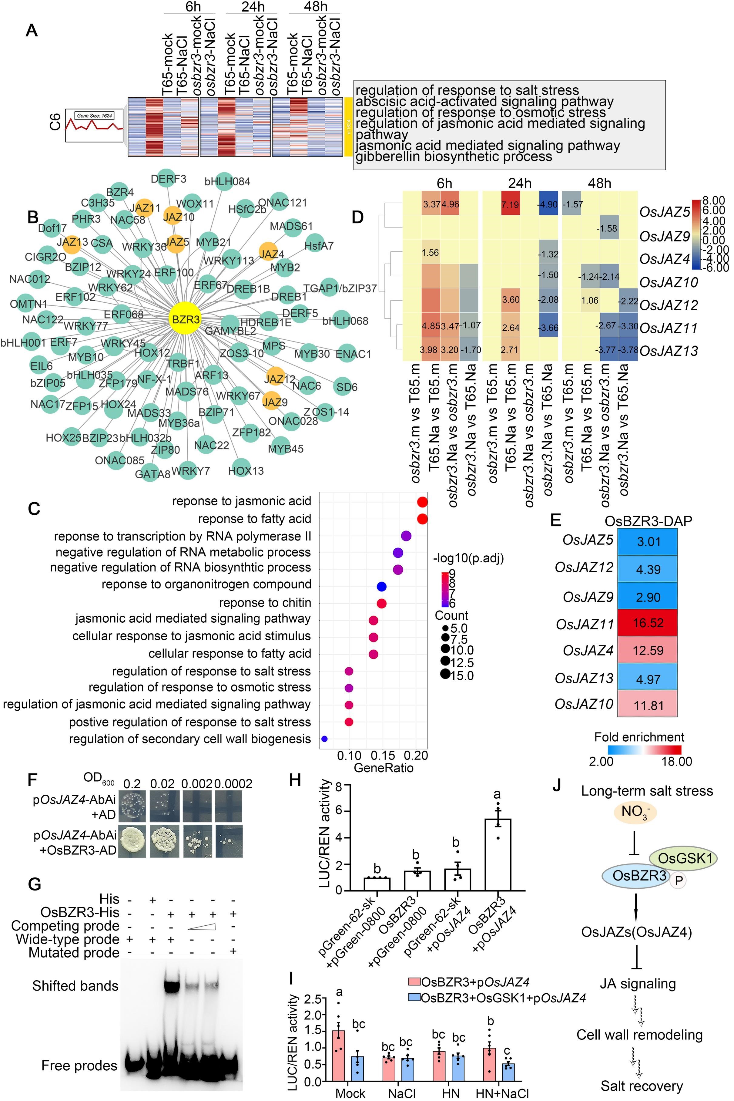 同时,时间性转录组分析发现,盐胁迫依赖于OsBZR3调控茉莉酸(JA)信号途径分子网络,多数JA抑制因子Jasmonate ZIM-domain Protein(OsJAZs)家族基因与OsBZR3共表达,且在盐胁迫下osbzr3突变体根中表达下调。在此基础上,进一步通过DAP-seq、酵母单杂、EMSA及LUC实验证实,OsBZR3可直接靶向OsJAZ4启动子并激活其表达,且该激活作用受OsGSK1、盐胁迫及KNO3及其组合处理的调控。进一步定量分析与功能验证结果支持,盐胁迫与KNO3可能通过OsBZR3对OsJAZ4的调控,介导JA信号转导,从而参与细胞壁发育的调控过程,并进一步影响作物长期盐胁迫下的生长恢复。