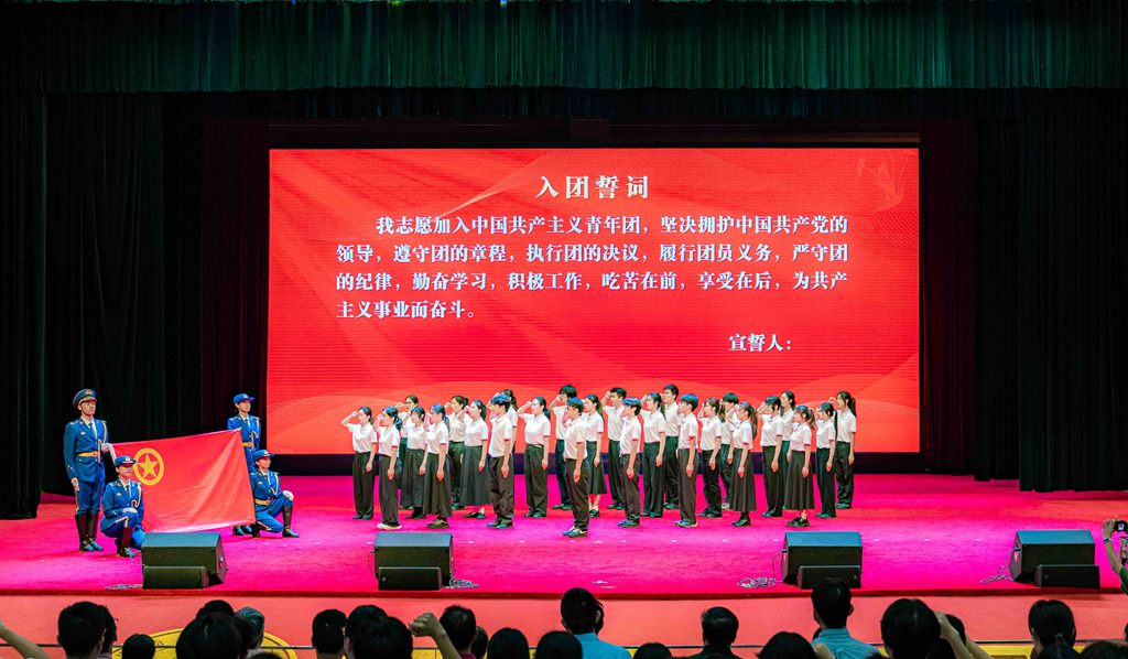 入团仪式上,近千名新团员佩戴团徽,面向团旗庄严宣誓。新团员代表、公共管理学院2024级行政管理专业学生黄锦浩表示,从参与十五运会志愿服务到申请入团,他越来越体会到“入团不是一句口号,而是一份沉甸甸的责任”,今后自己将在学业上求真务实,在集体中主动担当。优秀团员代表、艺术学院2024级广播电视编导专业学生鄢钰涵也分享了自己从省青马学员、校园记者到参演《布衣院士》的经历,表示会继续用镜头和作品传递温暖,服务同学、服务集体。
