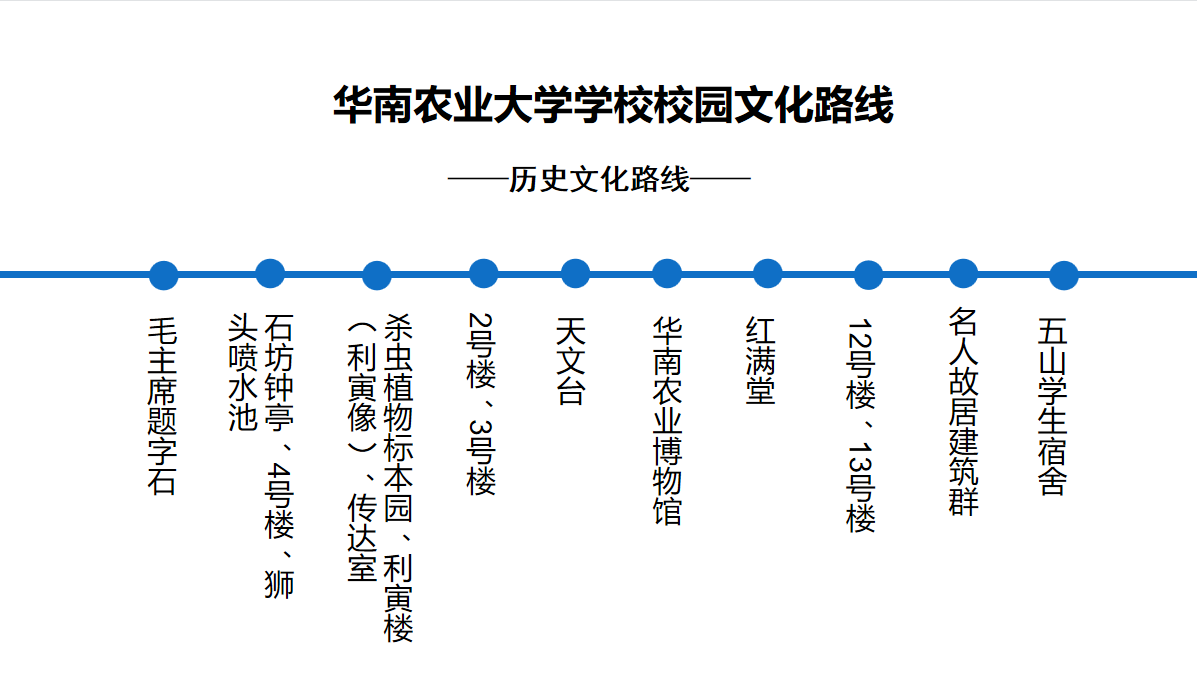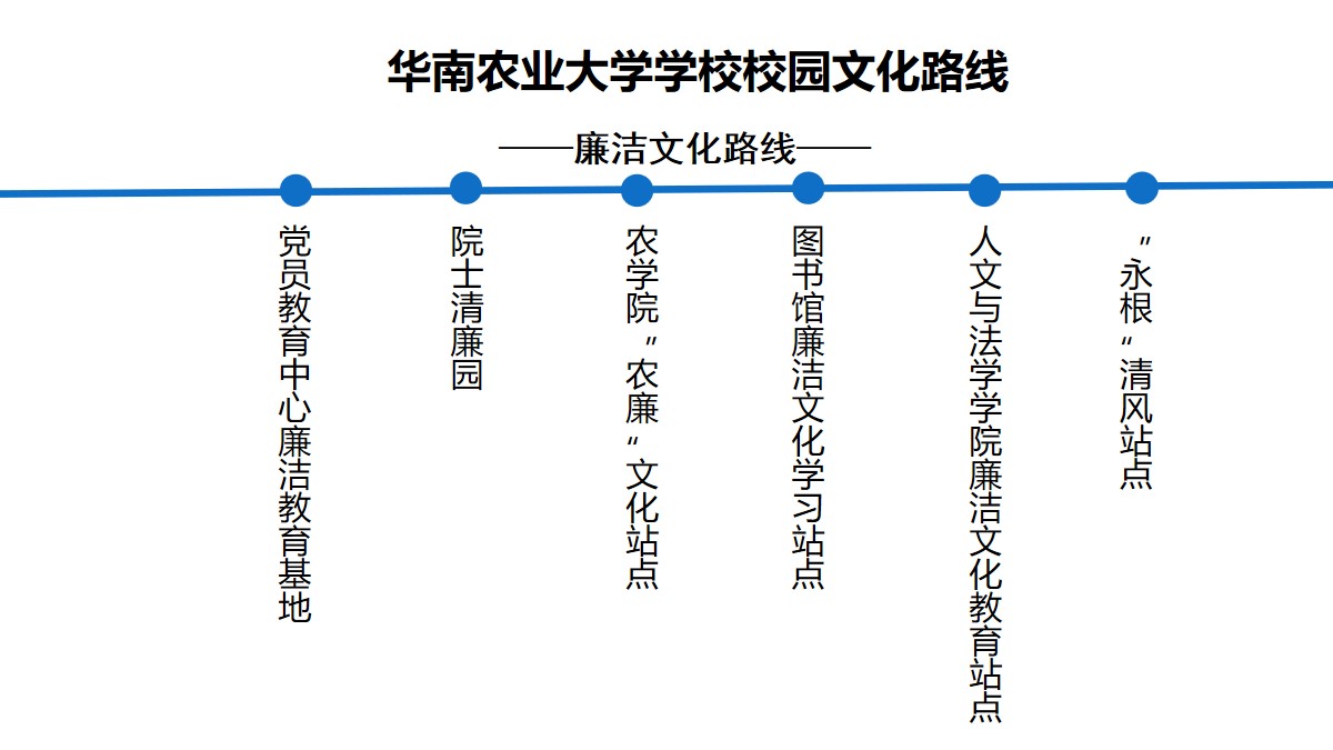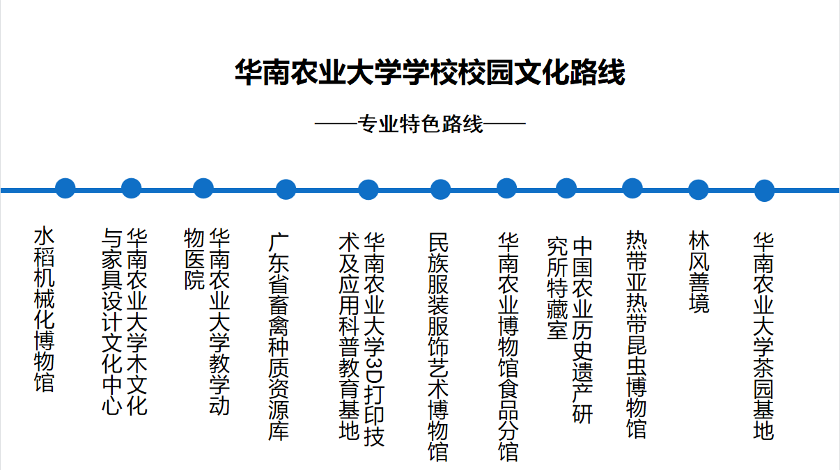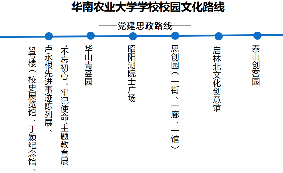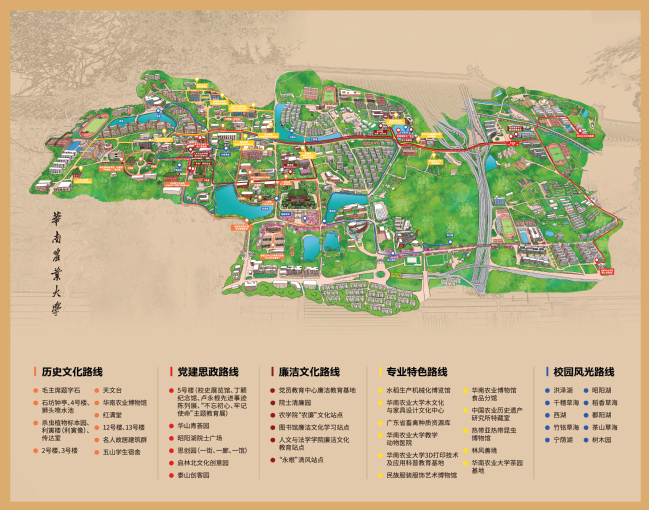 华南农业大学结合校园自然景观、历史景观和功能定位,分步骤建设历史文化、党建思政、廉洁文化、专业特色、校园风光等5条校园文化路线,打造校园文化集群和文化站点,不断提升文化育人实效,为建成农业特色世界一流大学提供坚实精神文化支撑。