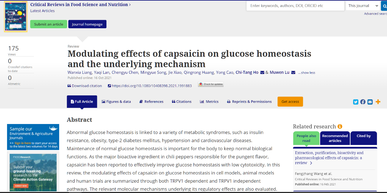 在Critical Reviews in Food Science and Nutrition上发表题为“Modulating Effects of Capsaicin on Glucose Homeostasis and the Underlying Mechanism”的论文,影响因子为11.176。(原文链接:https://www.tandfonline.com/doi/abs/10.1080/10408398.2021.1991883?journalCode=bfsn20)
