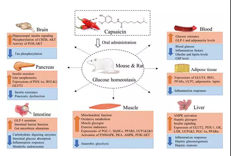 葡萄糖稳态异常能导致多种代谢综合征症状表现,如胰岛素抵抗、肥胖、2型糖尿病、高血压和心血管疾病,可见葡萄糖稳态对维持机体正常的生物功能非常重要。辣椒素是辣椒中的主要生物活性成分,许多研究表明辣椒素通过激活TRPV1离子通道能有效改善机体葡萄糖稳态。