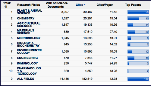 1月13日,科睿唯安公司(Clarivate Analytics)发布了ESI学科最新数据,我校免疫学首次进入ESI全球前1%,实现了我校ESI学科建设的再突破。截至目前,我校进入全球前1%的ESI学科达10个,分别是:植物学与动物学、化学、农业科学、材料科学、微生物学、生物学与生物化学、环境科学与生态学、工程学、免疫学、药理学与毒理学(依被引次数排序,图1)。