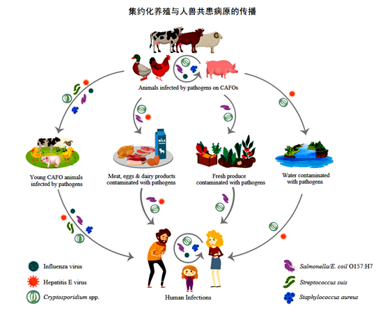 近几十年,家畜的集约化养殖促使畜牧业高速发展,但同时也致使易感动物饲养密度过高、遗传多样性减少、流动频率增加(如进口优质品种、公犊牛转移到小牛和肉牛养殖场等),从而为一些人兽共患病原(高致病性禽流感病毒、戊型肝炎病毒、大肠杆菌O157:H7、猪链球菌、动物源耐甲氧西林金黄色葡萄球菌和微小隐孢子虫)的传播提供了有利条件。这些病原的跨种传播不仅增加了病原在集约化养殖高度发达国家人群中的传播几率,同时也改变了疾病传播模式,最终导致人群发病率增加、动物接触性感染和食源性/水源性疾病频繁暴发等。近年来,类似的病原传播模式也开始出现于集约化养殖逐步兴起的发展中国家,导致一些新发人兽共患病原的在这些国家涌现,我国人群中出现的3型和4型戊型肝炎病毒以及猪链球菌便是例证。