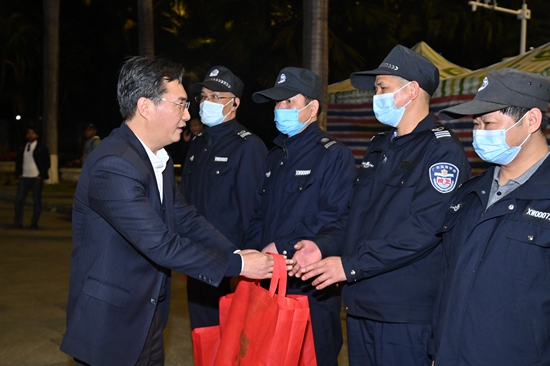 钟强一行先后看望慰问了行政楼值班室、学校各门岗、教学楼、饭堂、宿舍区工作人员及校医院、附属小学、幼儿园和水电用房等地的在岗值班人员。钟强代表学校充分肯定了各岗位人员过去一年在疫情防控常态化工作中所做的贡献,对他们的辛勤付出表示衷心感谢,希望他们继续支持学校事业发展,齐心协力做好疫情防控工作,为师生创造更加安全稳定的校园环境。