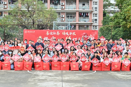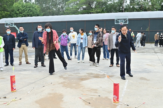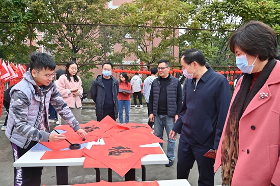 1月25日上午,学校在燕山区篮球场举行送福字猜灯谜和趣味运动会活动,吸引了众多留校学生到场参与,活动现场弥漫着欢声笑语,到处一派喜庆祥和的气氛。“我们代表学校给同学们拜年啦!祝同学们虎年大吉大利,学习生活顺心如意!”王斌伟、刘雅红和钟仰进来到活动现场,代表学校为大家送上节日问候和新春礼物,并与同学们一起参与活动。