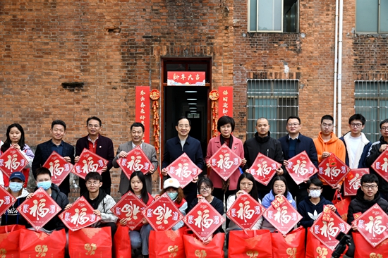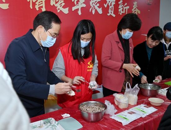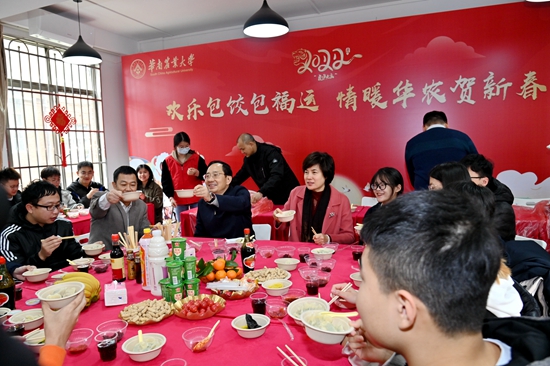 “家住哪里?在学校过节还习惯吧?有空要多跟家人通通电话、报报平安!”“这个饺子包得不错,等会就尝尝你包的饺子味道如何!”在小五山宿舍区,王斌伟、刘雅红和钟仰进与留校同学一起包饺子、话家常,了解留校学生的假期安排,叮嘱大家留校期间规律作息、注意安全,喜气洋洋迎新年。煮好刚包好的饺子,校领导和同学们围坐一桌,边吃边聊,举杯同庆即将到来的虎年新春,“祝大家新的一年学业有成、万事如意!祝学校在新的一年蒸蒸日上、再创新高!”