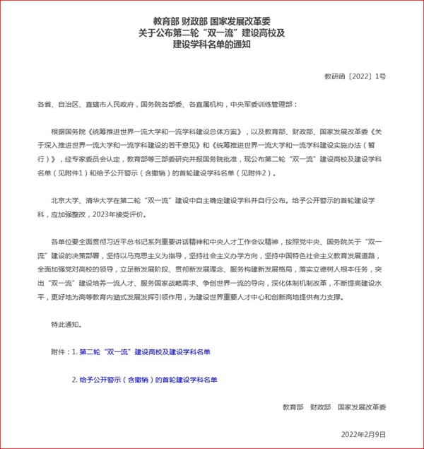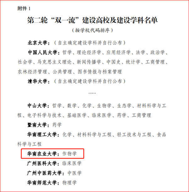 2月14日,教育部、财政部、国家发展改革委公布第二轮“双一流”建设高校及建设学科名单,华南农业大学入选。