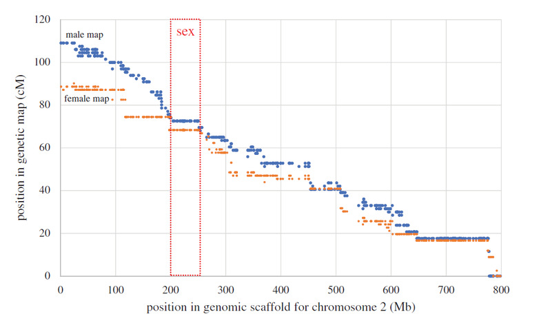 Figure 2. Genetic versus physical positions on chromosome 2 in the female G. biloba genome assembly [15] for male (blue) and female (orange) genetic maps. The dotted box shows the genomic location of the sex-determining locus, as located by genetic mapping. For other chromosomes see the electronic supplementary material, figure S3. (Online version in colour)