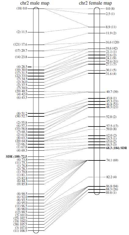 Figure 1. Male and female genetic maps for chromosome 2. Genetic positions (cM) are shown to the left of the male map and to the right of the female map. The numbers in brackets show how many markers co-locate to the same position in the map. The locations of the markers in the male and female maps are connected with a dashed line.