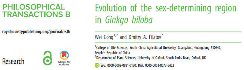 3月21日,英国皇家学会的学术期刊Philosophical Transactions of the Royal Society B(IF2020=6.237)在线发表了我校生命科学学院龚维副教授题为“Evolution of the sex-determining region in Ginkgo biloba”的研究论文(论文链接:https://royalsocietypublishing.org/doi/pdf/10.1098/rstb.2021.0229)。该论文确定了银杏性染色体性别决定区域的位置和大小,揭示了银杏性染色体非重组区的分子进化特征,为银杏性染色体的起源时间提出了新的证据。