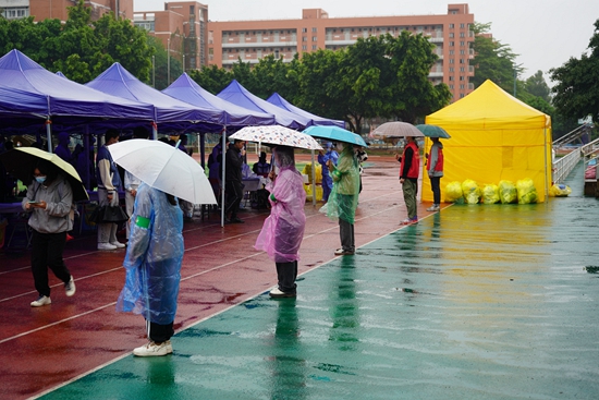 检测当日,虽阴雨绵绵,但现场高效、有序、温暖。来自天河区中医院的30余名医务人员与教工突击队队员、学生志愿者、校医院、保卫处、总务部等部门共300余人组成服务团队,在广大师生员工的积极配合下,历时9个小时,高效完成了总计46792人的核酸检测工作,彰显“华农速度”。
