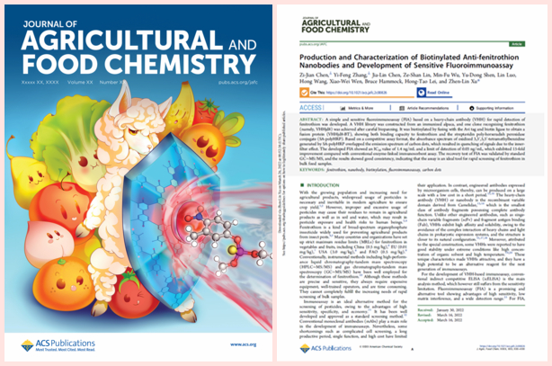 近日,农业科学领域国际权威期刊Journal of Agricultural and Food Chemistry以Supplementary Cover形式在线发表了题为“Production and Characterization of Biotinylated Anti-Fenitrothion Nanobodies and Development of Sensitive Fluoroimmunoassay”的文章。文章通讯作者为食品学院徐振林教授,第一作者为博士后陈子键和硕士生张译丰。