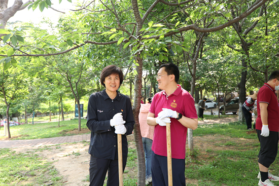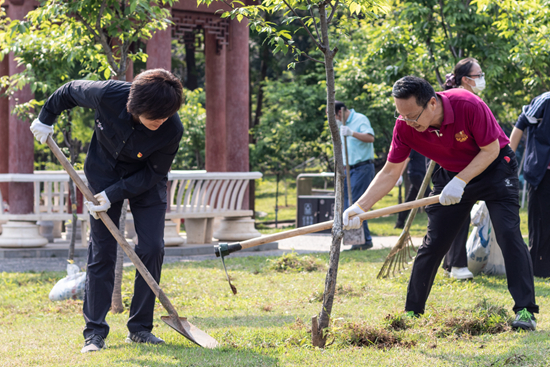 劳动现场一片热火朝天景象。刘雅红和老师们一起领取劳动工具,为樱花剪除枯枝,清理落叶,铲除杂草,撒施肥料,培土护苗。她向毕英佐长期关心、支持学校校园文化建设表示感谢,并就校园文化建设、学科发展、教职工发展等内容与老师们进行深入交流,并对青年教师进一步践行立德树人使命,助力学校双一流建设提出希望。