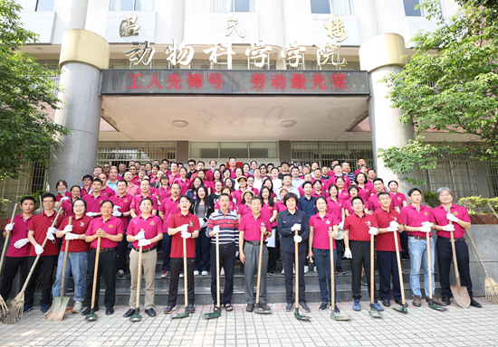春回大地,草长莺飞,4月6日,校长刘雅红、校工会常务副主席覃枝安、动物科学学院毕英佐研究员及动物科学学院全体教职工一起参加“全国工人先锋号·劳动最光荣”樱园集体劳动。