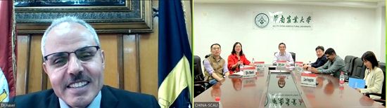 我校植物保护学院副院长金丰良、邱宝利教授、Ali Shauket副教授,埃及苏伊士运河大学农学院院长Mohamed Abdelnaeem教授、语言学院及孔子学院院长Hassan Ragab参加视频会议。