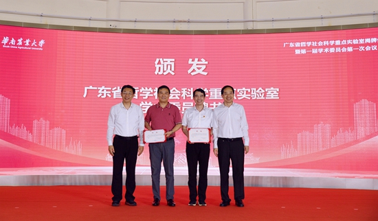 乡村振兴实验室和农业农村政策与改革创新实验室第一届学术委员会由7位委员组成,包括中山大学副校长、岭南学院院长李善民,中国人民大学农村发展研究院教授程国强,国务院发展研究中心农村经济研究部部长叶兴庆,农业农村部农村经济研究中心副主任陈良彪,我校国家农业制度与发展研究院院长罗必良、发展规划处处长章家恩、经济管理学院执行院长罗明忠。张知干、王斌伟为现场出席仪式的重点实验室学术委员颁发了聘书。