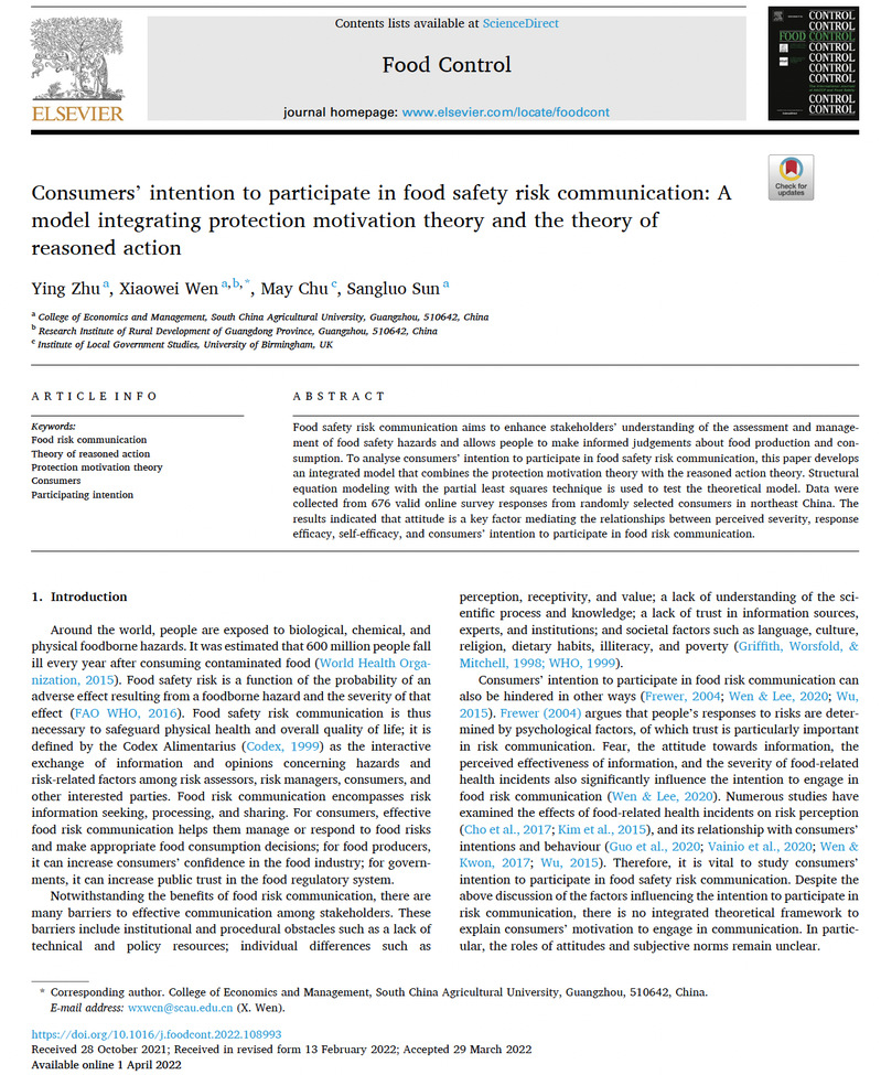 日前,我校经济管理学院文晓巍教授团队在国际权威期刊Food Control (SCI, JCR Q1,中科院大类分区1区, IF=5.548) 发表论文“Consumers’ intention to participate in food safety risk communication: A model integrating protection motivation theory and the theory of reasoned action”(链接:https://www.sciencedirect.com/science/article/pii/S0956713522001864),文晓巍教授为通讯作者,其博士生朱莹为第一作者,共同作者包括伯明翰大学朱湄教授及我校博士生孙桑落。
