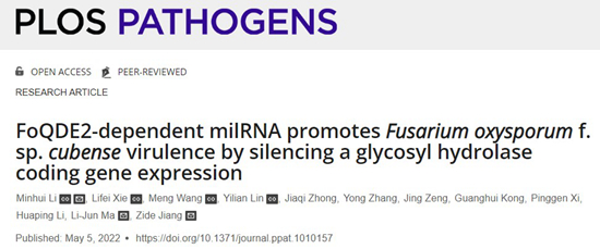 近日,我校植物保护学院、广东省微生物信号与作物病害防控重点实验室姜子德/李敏慧团队在PLoS Pathogens(IF,6.823,中科院1区Top期刊)上在线发表了题为“FoQDE2-dependent milRNA promotes Fusarium oxysporum f. sp. cubense virulence by silencing a glycosyl hydrolase coding gene expression ”的论文。