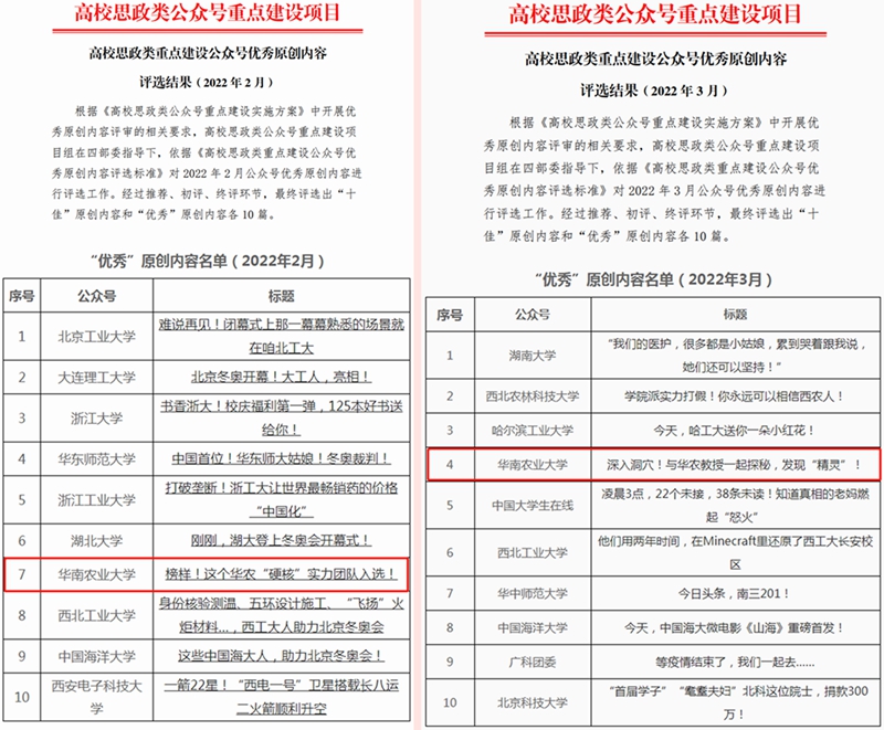 为充分发挥新媒体平台对高校思想政治工作的促进作用,推动高校公众号成为思政教育有效载体,聚焦高校思政工作时代特点和高校师生现实需求,中央宣传部、中央网信办、教育部、共青团中央于2021年5月公布了“全国首批高校思政类公众号重点建设名单”,我校官微入选。全国仅40所、广东省仅2所高校上榜该类别名单。