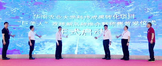 广东省农业农村厅总经济师罗一心,华南农业大学副校长咸春龙,“巨美人”研发团队负责人、园艺学院院长胡桂兵,园艺学院党委书记张贻发,广东省湖北商会会长滕华国,广州市从化华隆果菜保鲜有限公司董事长欧阳建忠等人上台共同启动“巨美人”荔枝新品预售。