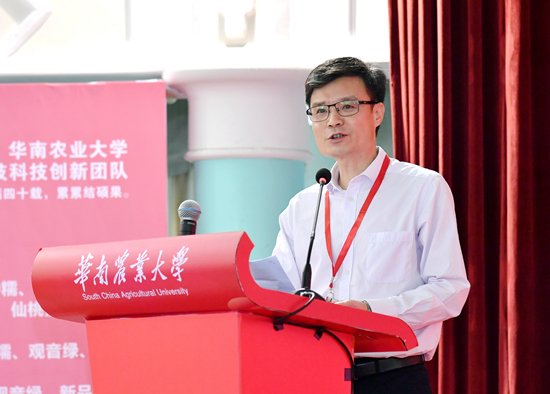 王斌伟在致辞中表示,作为国家“双一流”建设高校,华南农业大学历史悠久,底蕴深厚,是国内最早开展荔枝研究的单位之一,既有实力雄厚的研发团队,也有服务产业的推广团队。多年来,学校对荔枝产业科技难题坚持不懈开展攻关,打造了一支特色优势明显、产学研深度融合、在国际上有显著影响力的荔枝科技创新团队,在荔枝的基础研究、应用研究和产业发展上都取得了骄人的成绩。目前,华农荔枝科技创新团队已经育成了优质荔枝新品种19个,为我国的荔枝产业的可持续发展奠定了坚实的品种基础。今天推介的“巨美人”荔枝新品种是我校荔枝科技创新团队培育的优质荔枝新品种的典型代表,历时14年培育而成,是荔枝杂交育种的突破性成果。希望我校的荔枝科技创新团队以“双一流”建设为契机,继续保持我国荔枝育种水平的国际领先地位,推动我国荔枝产业高质量发展,为服务乡村振兴作出新的更大的贡献。