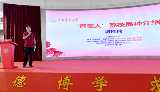 “巨美人”研发团队负责人、我校园艺学院院长胡桂兵教授上台介绍“巨美人”荔枝新品种的选育过程、主要特征和发展思路。自20世纪80年代起,我国荔枝产业迅猛发展,产业规模迅速扩大,荔枝走进寻常百姓家,成为了市面上销售的大众水果。但荔枝产业在快速发展的同时,也面临着许多问题,其中最为突出的就是品种结构单一。优质品种占比低,“黑叶”和“怀枝”等低效品种同质化严重,产期短而集中,产业效益低,严重影响荔枝种植的经济效益。