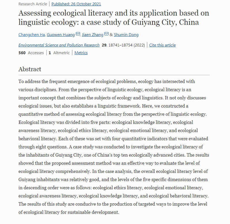 日前,我校外国语学院、生态语言学研究所黄国文教授团队在环境科学与生态学领域知名期刊Environmental Science and Pollution Research(SCI,JCR Q2)发表论文“Assessing ecological literacy and its application based on linguistic ecology: a case study of Guiyang City, China”(论文链接:https://link.springer.com/article/10.1007/s11356-021-16753-7),黄国文教授和我校资源环境学院章家恩教授为共同通讯作者,其博士生哈长辰为第一作者。