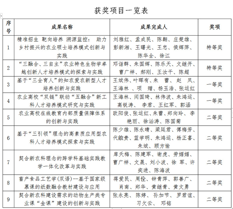 近日,广东省教育厅下发了《关于公布2021年广东省教育教学成果奖获奖项目的通知》(粤教人函〔2022〕13号),我校喜获9项高等教育教学成果奖,其中,特等奖2项、一等奖2项、二等奖5项。获特等奖数量与华南理工大学和暨南大学并列第二,获一等奖数量与暨南大学和华南师范大学等并列第四。这是我校继2018年获得国家教学成果奖一等奖、2019年获得省教学成果特等奖后取得的又一新成绩。