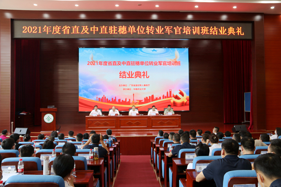 5月18日上午,广东省退役军人事务厅2021年省直及中直驻穗单位转业军官培训班结业典礼在我校第六教学楼二楼继续教育报告厅举行。广东省退役军人事务厅党组书记王创,我校党委书记王斌伟、副校长钟强,广东省军区转业办大校主任田利伟出席了结业典礼。结业典礼由广东省退役军人事务厅副厅长董仲琪主持。本期培训班的139名转业军官学员参加了结业典礼。