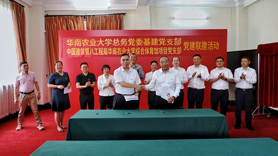 郭青松介绍了中建八局历史沿革及在国内建筑领域定位,他表示,本次与华南农业大学的党建联建,是新时代建立健全党建互促、优势互补的互帮互助机制,切实推动加强双方在业务合作上的深度融合。他就开展好党建联建提出几点建议:一是双方要充分认识党建联建活动的重要意义,实现党的建设与项目建设良性互动;二是双方要周密组织,增强共建活动实效,制定好的共建活动目标计划,真正做到互相学习、促进,共同提高;三是双方要积极创新、总结经验,建立共建共赢的长效机制,实现双方党组织战斗堡垒作用更明显、党员干部先锋模范作用更突出、党建资源整合更优化的目的。他表示,中建八局项目团队将增强责任感、紧迫感和使命感,以高昂的精神状态和高效的管理水平,打造优质、安全的“华南农业大学综合体育馆”项目精品工程。