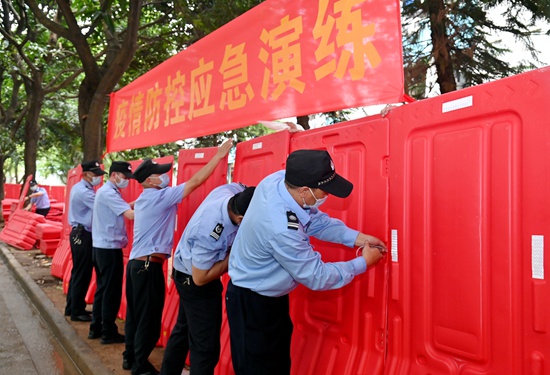 在泰山区汇景北出入口,校卫队员用铁马、警戒带对出入口进行封闭,演练校门封控管理,人员只进不出。对发生“疫情”的泰山区9栋进行封控、其他楼栋实行管控。校卫队员设置水马隔离墙,对泰山区9栋进行物理隔离,并安排人员24小时值守。