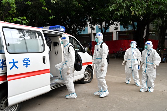 根据疾控中心的安排,“涉疫学生”在医生的指导下穿戴好防护装具,“核酸结果阳性同学”转运至定点医院,“密接者”转运到隔离酒店进行隔离。工作人员对泰山9栋进行消毒。