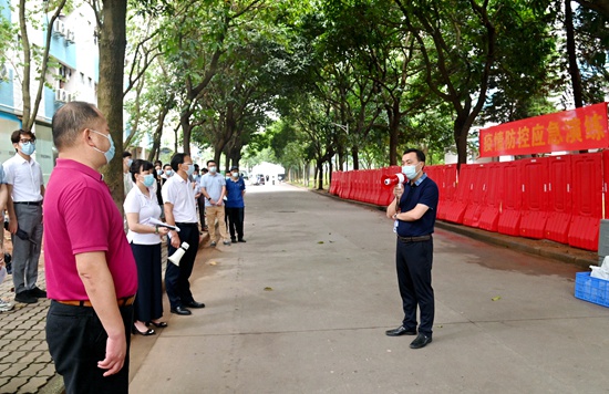 学校疫情防控领导小组成员单位主要负责人,相关学院党委副书记、辅导员,部分学生代表参加演练。为加强校地联动,完善校地联防联控工作机制,学校邀请了五山街道办副主任王岑岑、五山街道办公共服务办公室主任陶甄现场观摩指导。