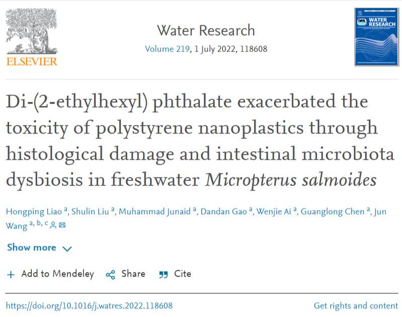 我校海洋学院王俊教授课题组在水资源与环境领域国际知名期刊Water Research(中科院1区,影响因子11.236)在线发表了题为Di-(2-ethylhexyl) phthalate exacerbated the toxicity of polystyrene nanoplastics through histological damage and intestinal microbiota dysbiosis in freshwater Micropterus salmoides的研究论文(论文链接:https://doi.org/10.1016/j.watres.2022.118608)揭示了纳米塑料(PS-NPs)和有机污染物邻苯二甲酸二辛酯(DEHP)对大口黑鲈的毒性效应。该论文的通讯作者为海洋学院王俊教授,第一作者为海洋学院2021级博士生廖洪平。