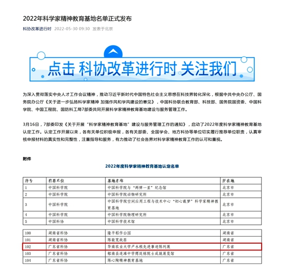 近日,由中国科协联合教育部、科技部、国务院国资委、中国科学院、中国工程院、国防科工局7部委(以下简称“7部委”)共同开展的2022年科家精神教育基地评选结果正式公布,华南农业大学卢永根先进事迹陈列展(以下简称“卢永根先进事迹陈列展”)与中国科学院、“两弹一星”纪念馆等140家单位从实际申报的473家单位中脱颖而出,成功入选,建设期至2026年。