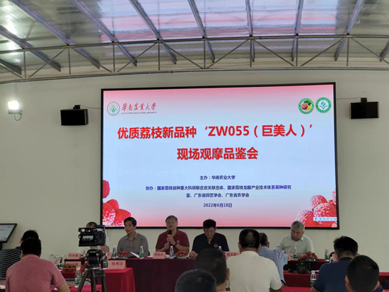 6月18日,由我校主办,国家荔枝良种重大科研联合攻关联合体、国家荔枝龙眼产业技术体系育种研究室、广东省园艺学会和广东省农学会协办的“优质荔枝新品种‘巨美人’现场观摩品鉴会”在阳江召开。会议由广东省农业农村厅种业管理处二级调研员陈坤朝主持,我校副校长咸春龙出席会议。