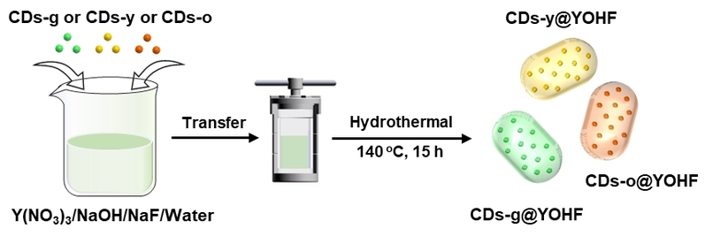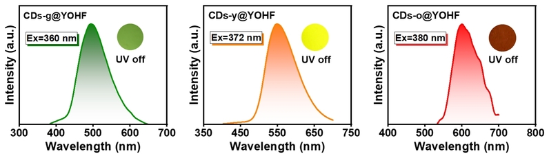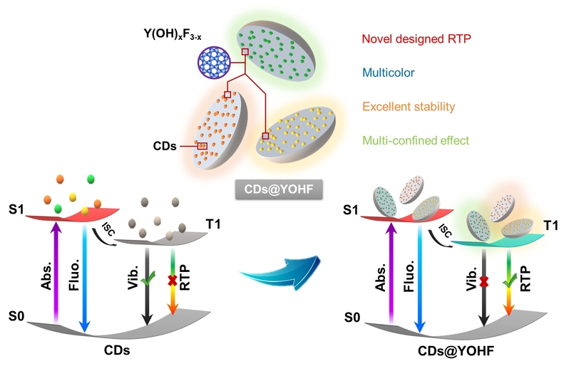 基于此,作者开发了一种新颖且通用的“CDs-in-YOHF”策略,通过将CDs引入到Y(OH)xF3-x(YOHF)基质中来合成具有明亮的绿色、黄色和橙色余辉的碳点基室温磷光材料。这种类型的无机材料首次被发现可作为激活CDs室温磷光的基质。研究表明,YOHF基质对CDs的空间约束以及CDs和YOHF之间的氢键和C-F键共同产生了多重限制效应,极大地抑制了CDs的分子内振动和旋转,从而有效地稳定了CDs的三重态激子,促进了磷光发射。这种效应被证实对大多数CDs稳定三重态有效进而产生RTP发射,即YOHF基质具有很好的普适性。