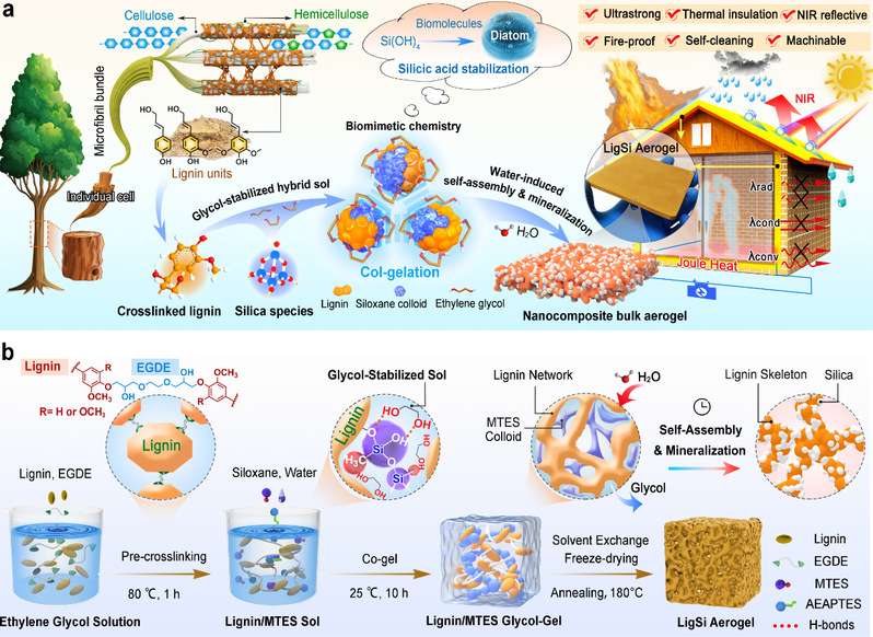 在硅藻中,硅酸缩合反应前的稳定化作用是通过生物分子(如多胺、多糖分子)干预非共价键相互作而完成的。受此启发,生物质材料·家居工程团队利用乙二醇作为仿生分子,成功稳定了交联木质素/硅氧烷共溶胶过程,并在此基础上通过“水诱导自组装&原位矿化”策略,成功制备了一种超强二氧化硅矿化木质素纳米复合气凝胶(LigSi)材料,该气凝胶具有可调节的多级微纳米结构和良好的机械加工性。优化后的LigSi具有比同类材料更高的比模量和比强度,并表现出优良的耐湿保温性、防火性、本征的自清洁/超疏水性以及近红外反射能力,因此在节能建筑领域具有潜在的应用前景。
