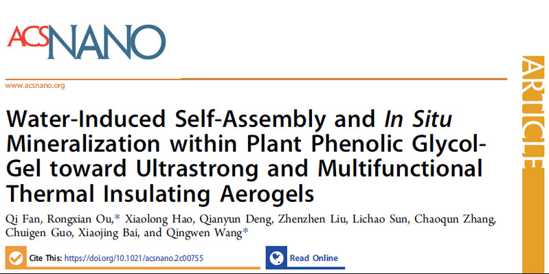 我校生物质工程研究院、材料与能源学院生物基材料与能源教育部重点实验室和岭南现代农业科学与技术广东省实验室王清文教授带领的生物质材料·家居工程团队在木质素基功能材料研究领域取得新进展,相关研究结果以“Water-Induced Self-Assembly and In Situ Mineralization within Plant Phenolic Glycol-Gel toward Ultrastrong and Multifunctional Thermal Insulating Aerogels”(论文链接:https://pubs.acs.org/doi/10.1021/acsnano.2c00755)为题发表在材料领域国际知名期刊ACS Nano上。